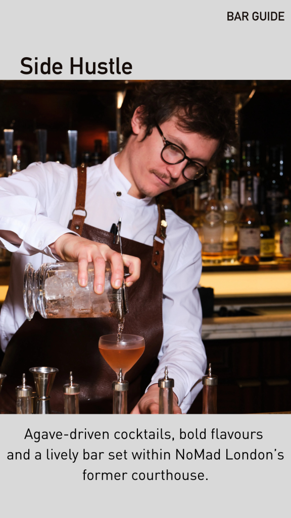 Located within NoMad London, Side Hustle is a lively yet intimate bar known for its agave-driven cocktails and bold flavours. A contemporary take on classic hospitality, where the bar is very much the heart of the hotel.