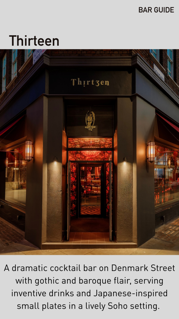 Located on Denmark Street in Soho, Thirteen is a dramatic cocktail bar defined by gothic details and baroque flair. Inventive drinks, Japanese-inspired small plates and a distinctly theatrical atmosphere make it one of London’s most immersive hotel bar experiences.